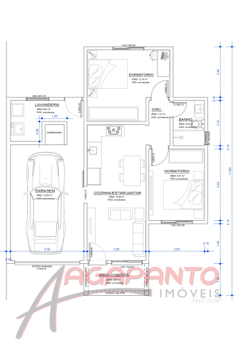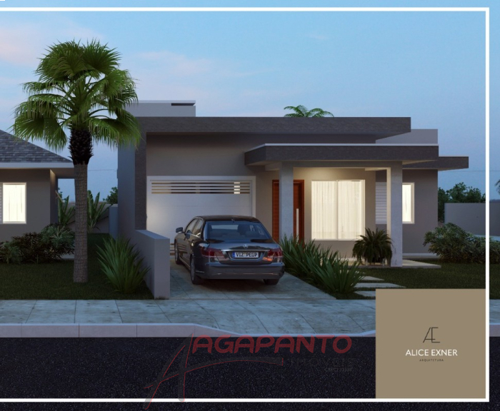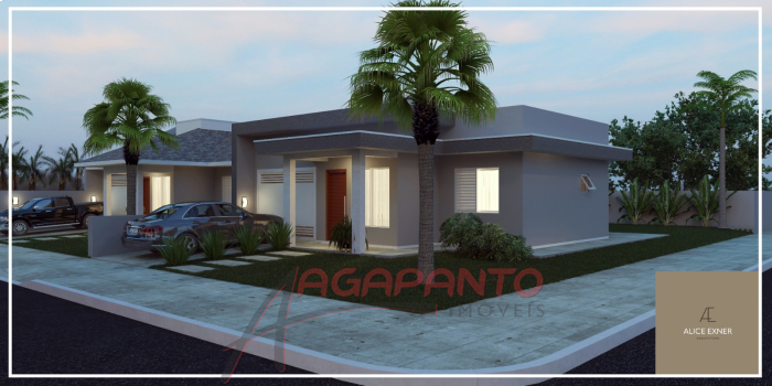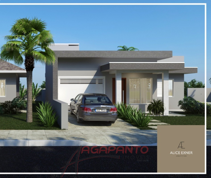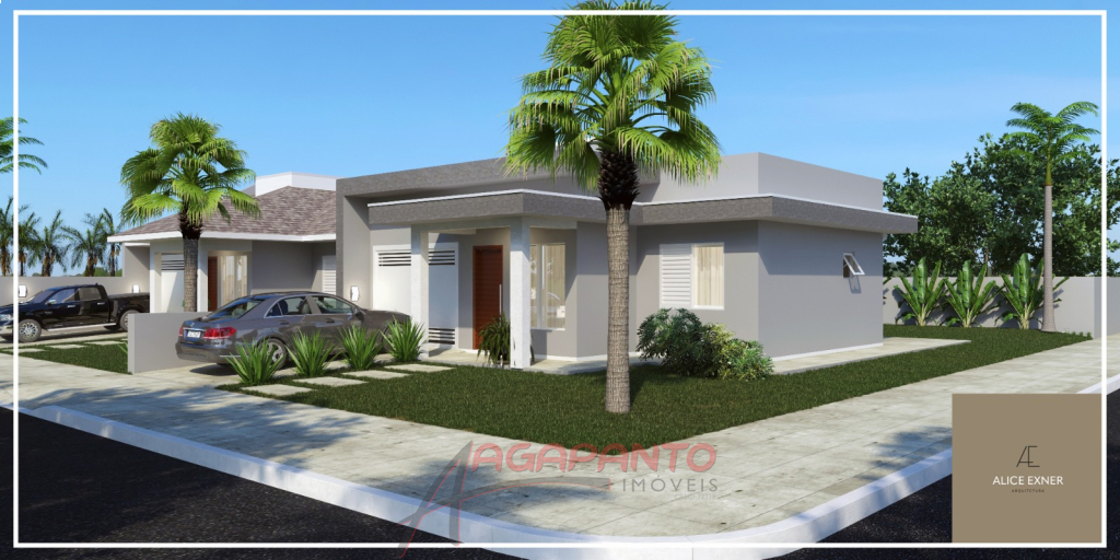 Casa de 85,37 m² com 2 quartos, banheiro, garagem para um carro, lavanderia, cozinha e sala de estar integrados. Ela está sendo construída em um terreno de esquina, plano, de 11,60 m de largura e 24,25 m de comprimento totalizando 281,30 m².